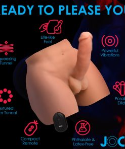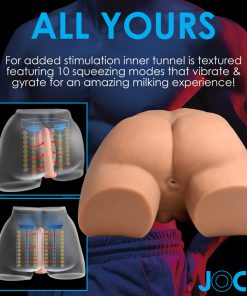 This vibrating and squeezing male masturbator toy is designed with your pleasure in mind! The soft, stretchy TPE is completely body safe, phthalate-free and latex free so you can play with it knowing you only have quality materials in and against your body. Designed with a realistic look and feel, enjoy having access to both a heavy shaft and a penetrable backside! The dildo is poseable so you can bend and curve it to suit what shape suits you best! On top of that, it has 10 powerful vibration modes that rumble inside you as you ride! Flip it over and enjoy the backside and rear entry, too! The anal canal is textured for your pleasure and has rows of rotating beads inside that squeeze and massage you when the canal is penetrated. Use the battery operated remote to control both the 10 vibrating and 10 squeezing modes from up to 16 feet away! This masturbator comes with a vibrating bullet that you can place inside to enhance your experience while you penetrate this masturbator's hole, and a warming wand to get it hot and ready for you! After you've completely satisfied yourself, use the cleaning kit included.