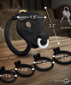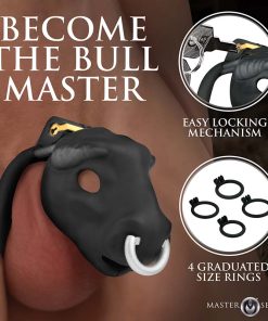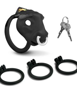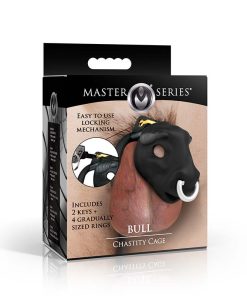 • Bull Themed Cage: Cage your raging bull by using this chastity cage! The bull head goes over the tip of the shaft, pressing it into place.