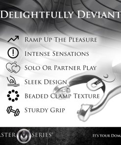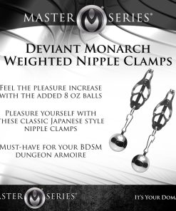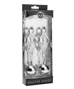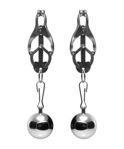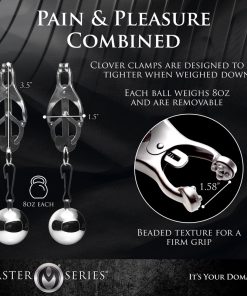 These ingenious clamps are specially designed to tighten their grip as they are pulled downward. The ends are tipped with ribbed rubber, to help retain their grip and add to the sensation. Each weight clips easily on to the end, supplying 8 oz of pull each, for a full pound of pressure total.