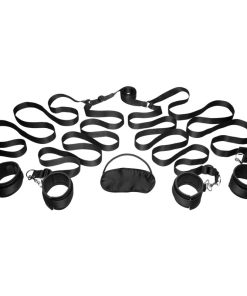 Measurements: Four restraint straps and connector strap adjust up to approx. 48 inches in length, cuffs adjustable up to approx. 16 inches around.