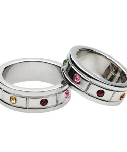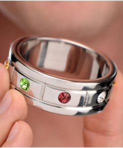 This colorful cock ring is made of smooth steel, etched in a band pattern and studded with rhinestones. Heavy and tight, it provides superior erection enhancement and can be heated up or cooled down for temperature play. The ring is solid and seamless, providing a feeling of weight as it regulates blood flow, helping you stay harder and last longer in style.
