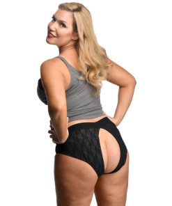 This great alternative to a strapon harness is comfy and compatible with all dildos! Play with a different dynamic with this Crotchless Panty Harness! This harness has a universal O-ring that can fit any strapon dildo. The wide, elastic waistband is comfortable and hugs you above the hips. Designed so that you can both give and receive pleasure during play, it is crotchless and has an open back that exposes your booty, too! This comfortable, easy to play in, supportive panty is made of nylon and is machine washable on a cold cycle. It can also be hand washed in mild soap and cool water.