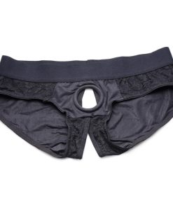 Slip these sexy panties on and then grab your chosen pegging dildo. Slip the dildo under the waistband and push it through the hole in the front. The O-ring will hold it in place and keep it from slipping it. Depending on the weight, it may need some manual support or it will pull the panties down. Grab some lube and your aroused partner and enjoy!
