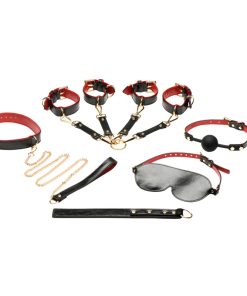 Spice things up with the Lover's Deluxe Bondage set! Within this one set is a ball gag, blindfold, collar, leash, wrists and ankle cuffs, a flexible slapper and hogtie connectors. The vegan leather is black and red and has a classy look that is accented by gold buckles. Enjoy the flexible slapper, sturdy wrist and ankle cuffs and adjustable collar. Attach the gold chain with its black handle to the collar and take your lover for a walk or control them in the bedroom! You can even combine this with a bedroom restraint system as you please! Enjoy muffling the moans of your lover with the comfortable, adjustable, phthalate-free silicone ball gag! Then give them a few spankings and enjoy the fun!