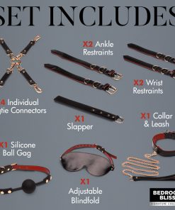 • Full Set of Fun!: Everything you need including a ball gag, blindfold, collar, leash, wrists and ankle cuffs, a flexible slapper and hogtie connectors.