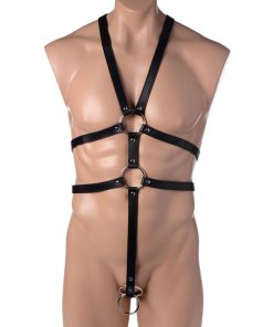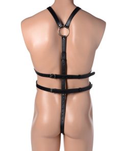 Strap into this full-body harness, designed to wrap seductively around your body and cock! Three adjustable straps ensure that this sexy bondage accessory fits most male bodies, with two cock rings that allow you to put your entire package through one, and just your cock through the other. Loom intimidatingly over your lover in this unique harness, or service your Master or Mistress. This device is perfect for those who fall into either Dominant or submissive roles.