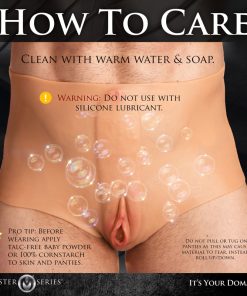 Before wearing, apply talc-free baby powder or 100% cornstarch to skin and panties before wearing. Do not pull or tug on the panties as this may cause the material to tear. Instead, roll the panties up/down over your skin when putting them on or taking them off similar to how you would put on/take off nylons. After use, wash the panties with warm water and mild soap. Air dry and store in a cool, dry location, away from direct sunlight and separate from other toys.