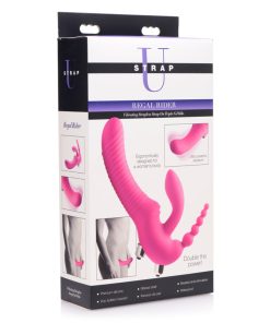 Ergonomically designed for the female body, this strapless strap-on provides clitoral, vaginal, and anal pleasure to the wearer while delivering a textured shaft with which to penetrate their partner. Furthermore, this remarkable couples toy thrums throughout all stimulation points with the power of two vibrating bullets. The bottom will appreciate a rippled, slightly curved shaft, perfect for stimulating the G-spot or P-spot. Meanwhile, the clitoral pad has two ridges that provide immense pleasure to the top with every thrust. A smooth penetrator is curved to directly target their G-spot, as well. Finally, the beaded anal stimulator provides a thrill of ecstasy as the seamless bulbs hum delightfully. This all-inclusive tool is waterproof, for enjoyment in all settings and an easy clean with mild soap and water. Made of premium silicone, it is non-porous, phthalate-free, and not compatible with silicone lubricants.