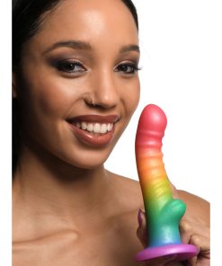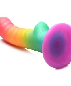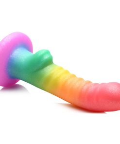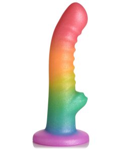 Combine fantasy and sexy play with this shimmering, rainbow colored dildo. The ribbed texture along the shaft is designed to stimulate you with each thrust. The curved round tip massages your P-spot, A-spot or G-spot. The small, ribbed, nub at the base can give a little extra something to rub against once the dildo is fully inserted and can stimulate either your perineum or clitoris. Made to be soft and flexible, it is easy to use for both beginners and advanced users alike. Let it bend to your will and fill you up! Made out of quality silicone so it's phthalate-free, latex-free, non-porous and hypoallergenic. Use it only with water-based lubricants for best results. The wide base makes it compatible with most strapon harnesses so you can indulge in fantasy roleplay and pegging! Or go hands-free and enjoy the strong, suction cup base when you place it on any flat surface! To clean it, simply wash it with warm water and mild soap, then spray it with a toy cleaner and pat dry after rinsing it off. Keep out of direct sunlight and away from extreme heat.
