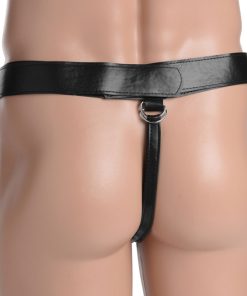 Designed to fit extra-large dildos or accommodate the male anatomy, this harness has a big metal O-ring that secures in place with 3 velcro straps. Perfect for a dildo with a scrotum -or an actual scrotum - the harness has a second O-ring cut into the vegan leather panel. The wide waistband and the thong strap are both adjustable to the perfect size. This is a great option for guys who enjoy a dramatic look, as well as pegging or female-female penetration play.
