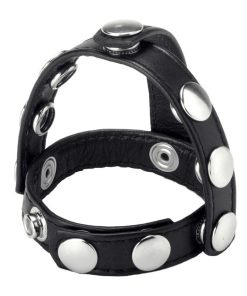 Measurements: Strap circling both penis and scrotum adjusts from 5.75 to 7.75 inches in circumference. Opening for penis adjusts from 4 inches to 9 inches in circumference. Ball separator measures 3.25 inches.