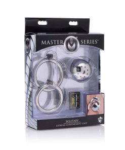 Lock up his dick in solitary confinement! His cock will not be getting any attention while it is trapped in this intensely constricting chastity device. Yank his cock and balls through one of the two base rings, sized differently to fit your submissive the way you like it. Lock the shaft portion of the cage in place, squeezing his flaccid cock for the ultimate incarceration. Now he is completely at your mercy, unable to find release unless you allow him to. This sturdy stainless steel cage can be worn for as long as you desire, with a faucet feature that allows him to urinate. His cock belongs to you… and you hold the key!