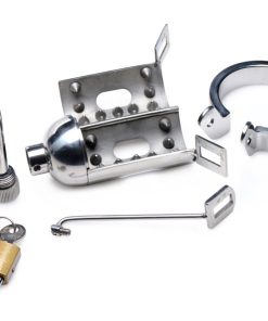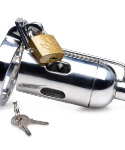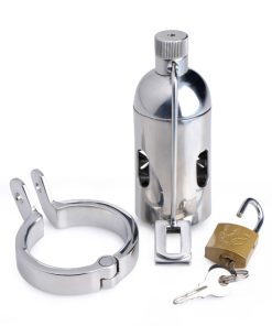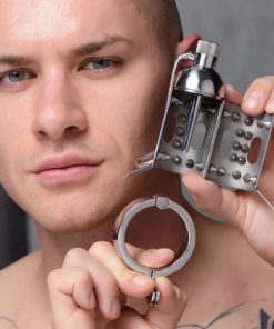 This maniacal chastity cage is built for the extreme! Lined with delicious spikes to bite on your dick while you are stretched from the pee-through sound. Squeeze your balls between the small space created from the included ball ring, and lock all three parts together with the included lock and keys and hand them off to your dom for complete submissions.