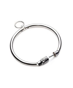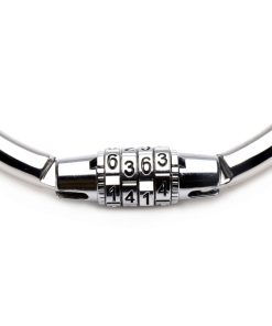 Adorn your slave in a symbol of their complete surrender to submission. This beautiful and heavy-duty collar is made of stainless steel, with a unique detail that sets it apart from other BDSM collars. A combination lock ensures that your plaything has no hope for escape until you offer release, just the way they like it! The O-ring on the front allows you to attach other bondage accessories, such as a leash or nipple clamps. The smooth, rounded edges make this a comfortable collar for private play or 24-7 wear.
