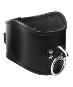 This 4-inch thick and tall curved posture collar is handmade of durable leather which will hold up to the struggling of the wearer. It forces the wearer to keep their neck perfectly straight with their chin out. It features a solid welded tri-ring on the front and a heavy locking roller buckle in back. It can be used with or without a lock.