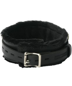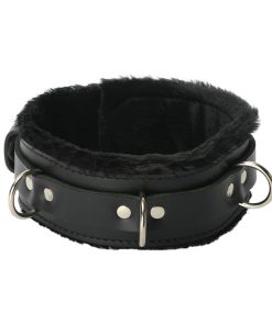 This collar is the ultimate blend of comfort and durability. It is fundamentally a wide strap of thick leather lined with two layers of ultra soft faux fur. It is wrapped with a 1 inch wide leather strap. The lockable buckle on the strap is compatible with any small padlock. With the fur included, this collar is an impressive 2 3/8 inches wide. Nine sizing slots ensure a comfortable fit.