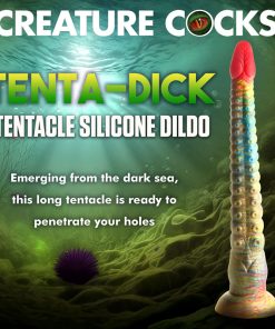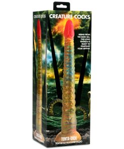 This long tentacle will reach deep inside you! Designed for backdoor enjoyment, this colorful tentacle dong has a row of suckers on one side and a ropey, ribbed shaft along its long, 11 inch tentacle arm. The colorful design mixes reds, yellows and blues to create a unique look that is scaly, mystical and stands out amongst your toys! Made out of premium, phthalate-free silicone, it has a firm core and is flexible and smooth. Use the wide, suction-cup base to keep it in place and use it hands-free, or combine it with a compatible strapon harness for kinky cosplay, fantasy roleplay, or hot pegging play! This thin dong has a tapered tip for easy insertion and gradually gets larger as you go deeper, but stays relatively thin so you can go further and play longer! After play is over, wash the dildo with warm water and soap and use a toy cleaner to spray clean. Wipe dry and store in a cool, dark place out of direct sunlight.