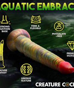 Fantasy Anal Hose: This extra long and thin tentacle dong is colorful with scale-like features due to the bubbles and swirls of red, yellow and blue inside of it. One side has a row of suckers while the rest of it is smooth and ribbed for your pleasure!