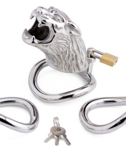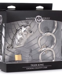Included: Tiger shaped cage, 3 graduating cock rings, one small padlock, 3 keys
