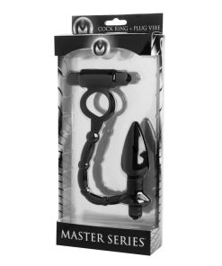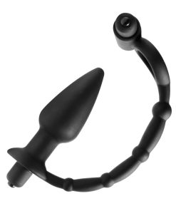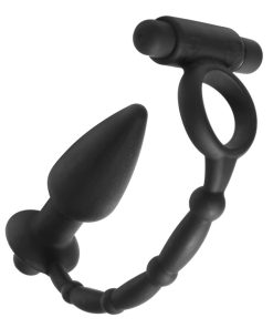 Tease them with double the pleasure...This dual stimulation cock ring and anal plug combo comes to you with devious pleasure for his cock and his ass. Enhance his erection with a vibration ring that connects to a delicious vibrating butt plug, allowing you to tease his most sensitive areas with waves of sensory pleasure. Made entirely of premium silicone, and powered by two independent vibrating bullets. Take it in the shower, this darkly sexy toy is splash proof!